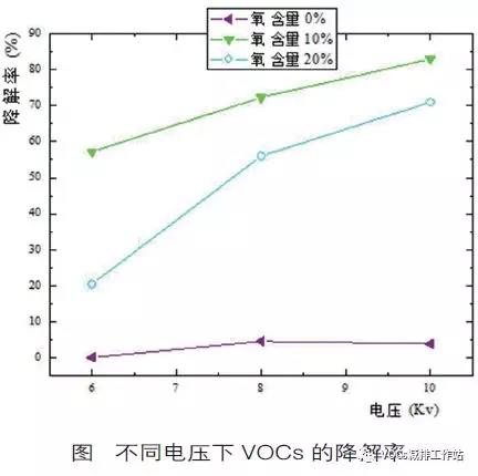 从以上图可知,等离子体对VOCs 的降解受废气中氧浓度影响比较大,同等电压下,废气中10% 的含氧量分别比0%、20% 的降解率高。