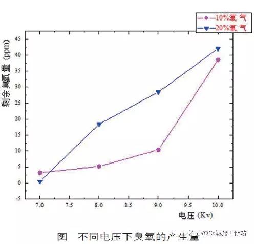从上图可知,不管废气中含氧量多少,增大等离子体的电压,生成臭氧量都会增加。虽然电压大,可以增大激发电弧的能量,从而加大对VOCs 的降解率,但是,同时电压越大产生的臭氧量越大。