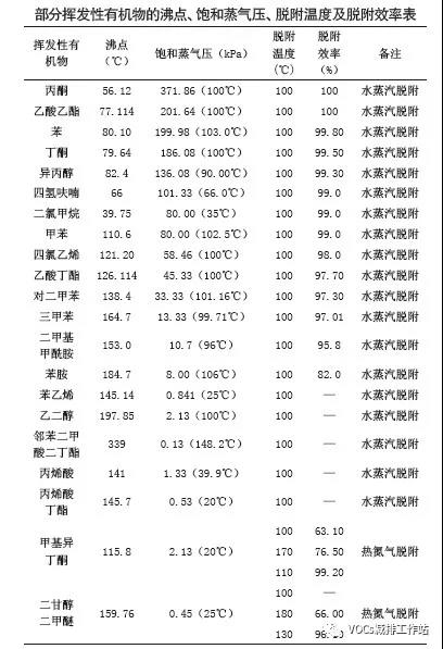在工程实践中可观察到部分挥发性有机物的脱附温度及效率见下表(来源:李守信,陈青松,罗鑫,等.吸附法处理VOCs脱附温度的选择[J].中国环保产业,2018,(3):48-50)。